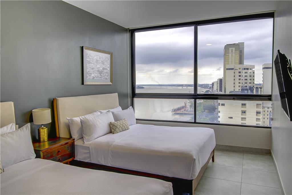 Noise from weekend nightlife keeps guests awake until 3am, so expect city sounds if you want a city view. Rooms lack full-length mirrors and offer good views. The location near Malecón 2000 puts you close to restaurants and walking areas, though heavy military presence nearby makes some travelers uncomfortable.