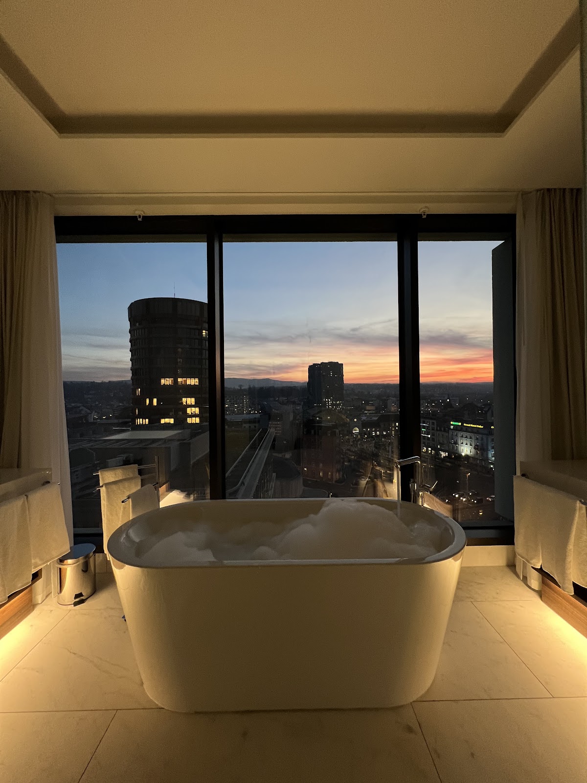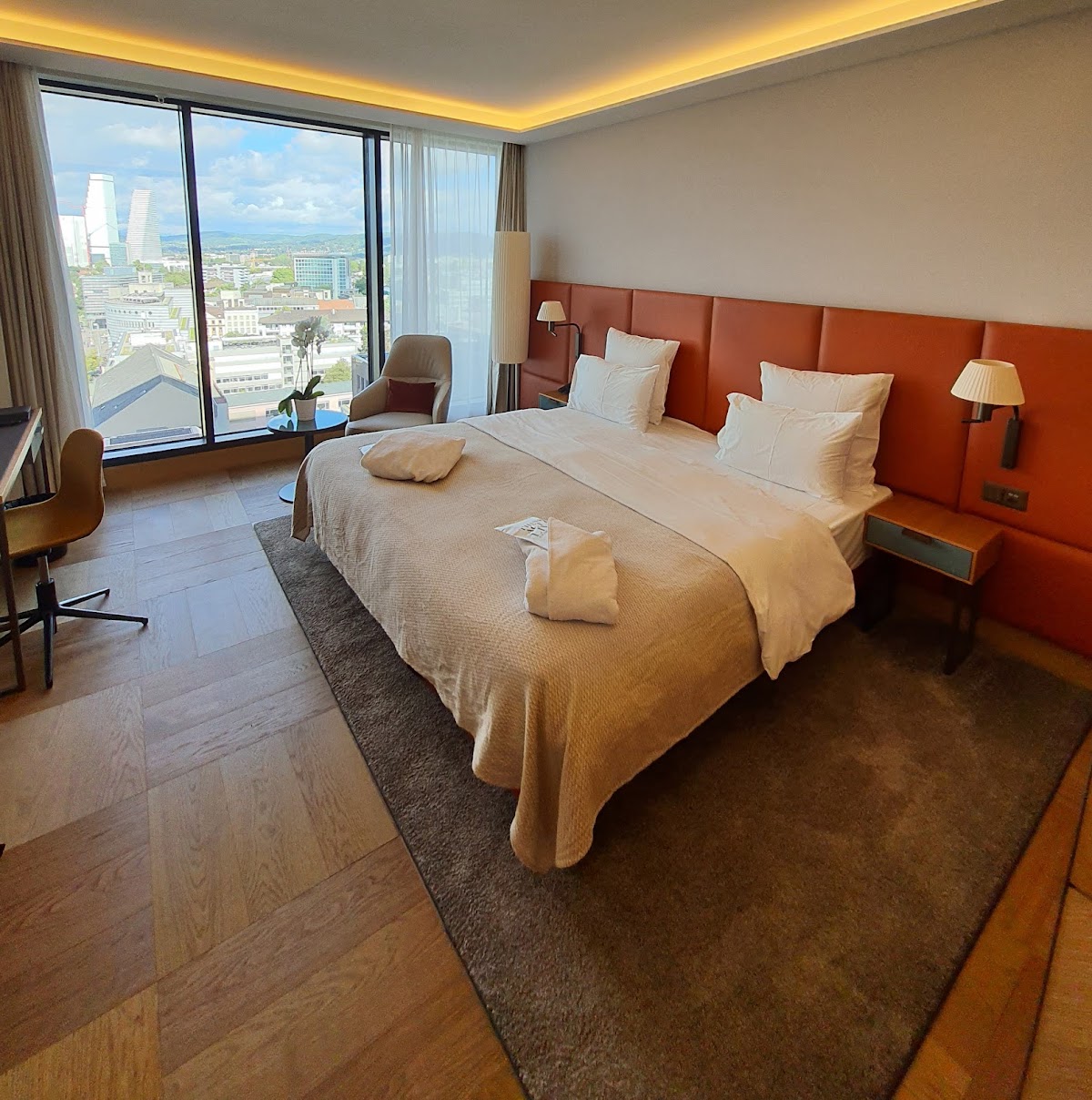 Rooms are spacious, modern, and quiet with excellent city views from higher floors. Beds are comfortable, showers have only half barriers instead of doors, and bathrooms are well-designed. Staff are professional and friendly, breakfast is excellent, and the train station location is unbeatable.